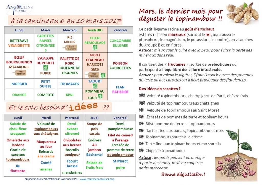 Voici les menus de la rentrée ! Avant les vacances,  nous avons redécouvert le PANAIS ; cette semaine, encore un légume oublié : le TOPINAMBOUR ! Voici quelques idées de recettes et astuces pour innover !